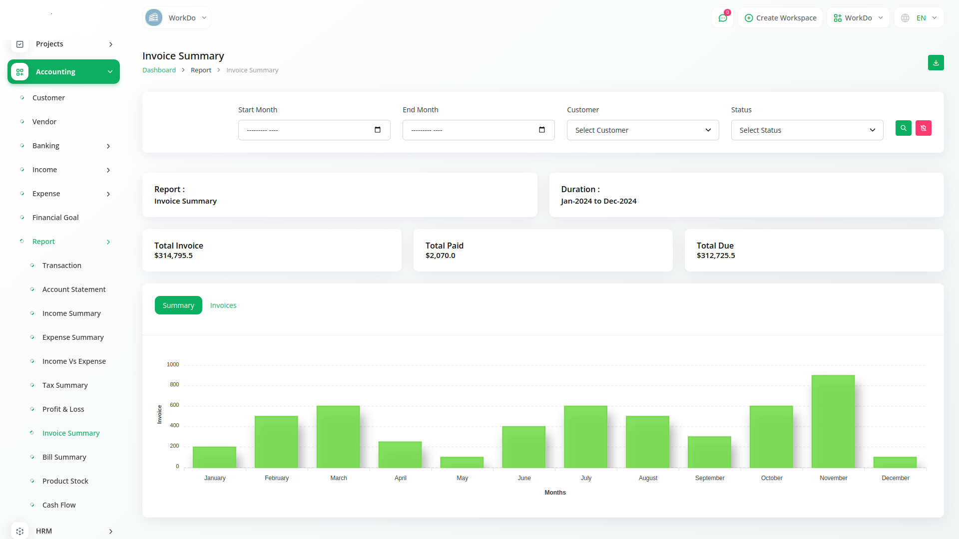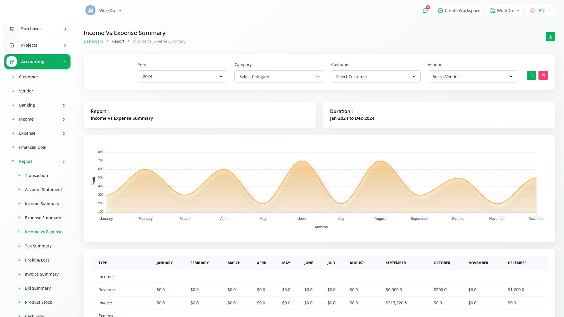 Get a report on transactions with an easy filtering option. Download the required account statements in either PDF, CSV, or Excel format. You get duly prepared reports on individual Income, Expenses, Tax, Invoice, and bill summary. Filter them based on Account, category, and customers. Also, a graphical display of the Income VS Expense chart along with a detailed calculation of Profit and Loss will help you make informed decisions. Filter the tax summary and Income VS Expense chart based on financial years.