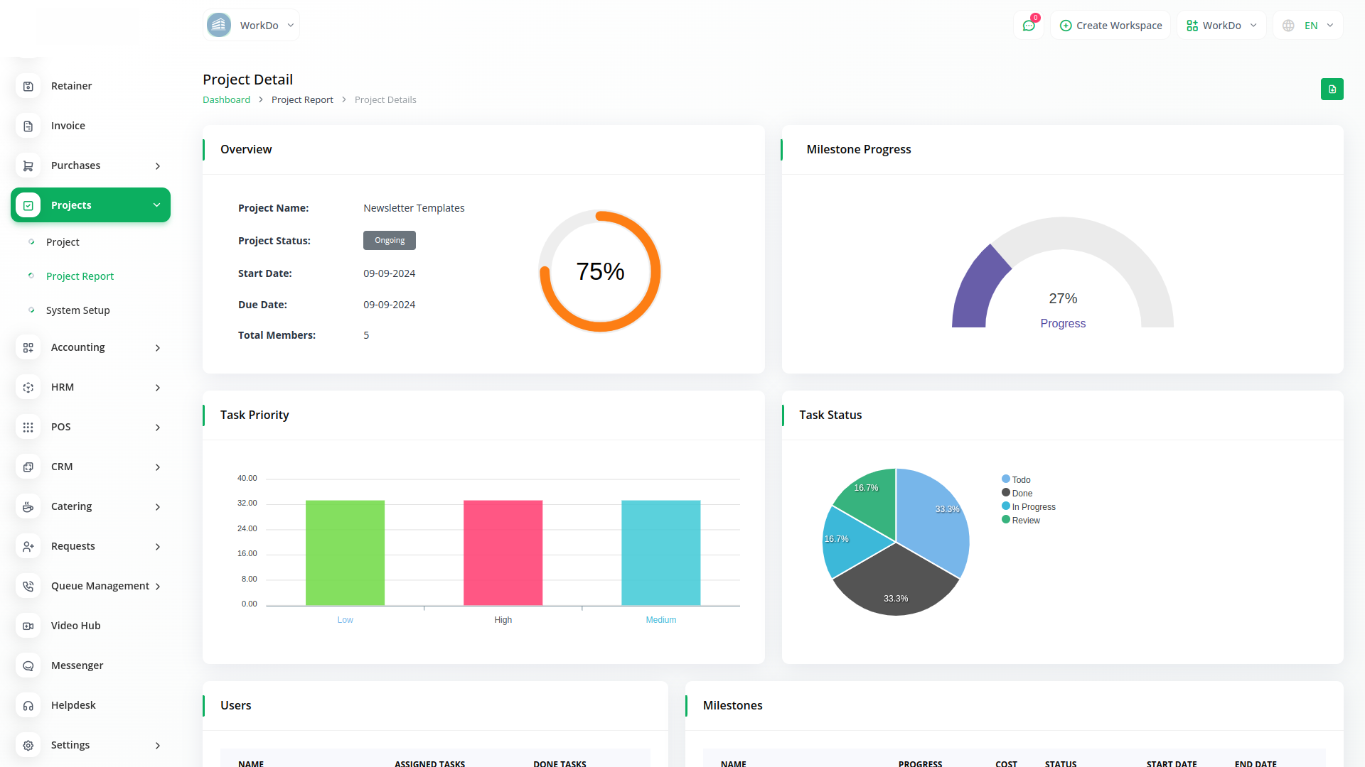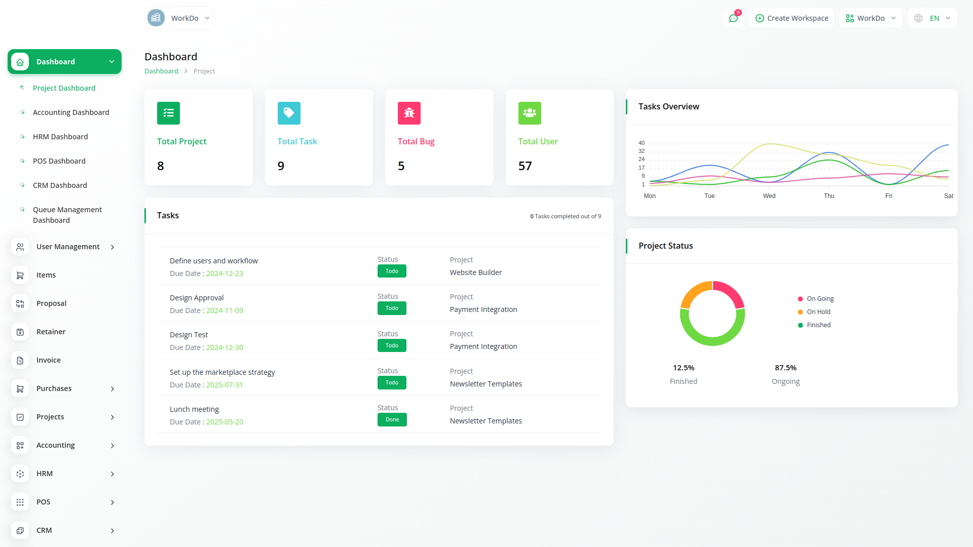 Get an overview of the total number of projects, tasks, bugs, and members. A visual representation of the task overview and project status can help you estimate the progress on each task. Lastly, you can check the top due task.