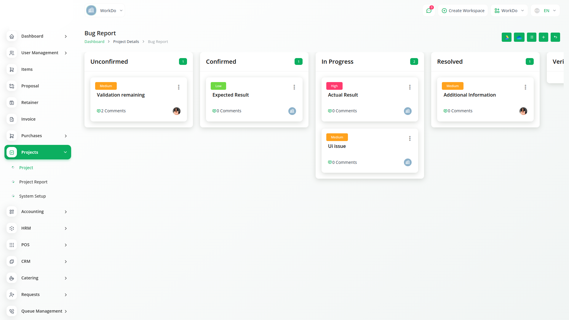 Create new bugs and assign users and priority to them. You can write a note in the text box for the bug description. Also, the status of each bug could be changed through an easy drop-down and Kanban drag system.